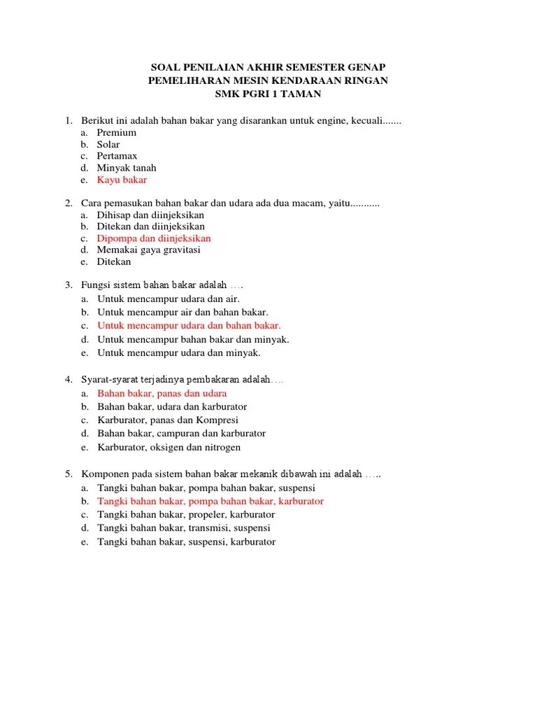 Soal dan jawaban pemeliharaan mesin kendaraan ringan kelas 12 … Contoh soal kelistrikan otomotif kelas 11 beserta jawaban lengkap format. Sistem cuk berfungsi untuk menambah suplai bahan bakar bensin saat kondisi mesin masih dalam keadaan . Latihan soal dan kunci jawaban uts semester ganjil mapel pmkr. Tipe efi ini mengukur kevakuman didalam intake manifold dan volume yang disensor berdasarkan kerapatan udara.